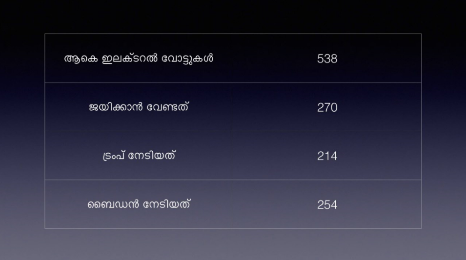 ഇരുനൂറ്റി അമ്പത്തിമൂന്നു ഇലക്ടറൽ വോട്ടുകളാണ് ജോ ബൈദന് ലഭിച്ചിരിക്കുന്നത്. ഇരുനൂറ്റി പതിമൂന്നു വോട്ടുകളാണ് പ്രസിഡന്റ് ഡോണാൾഡ് ട്രംപ് നേടിയിരിക്കുന്നത്.