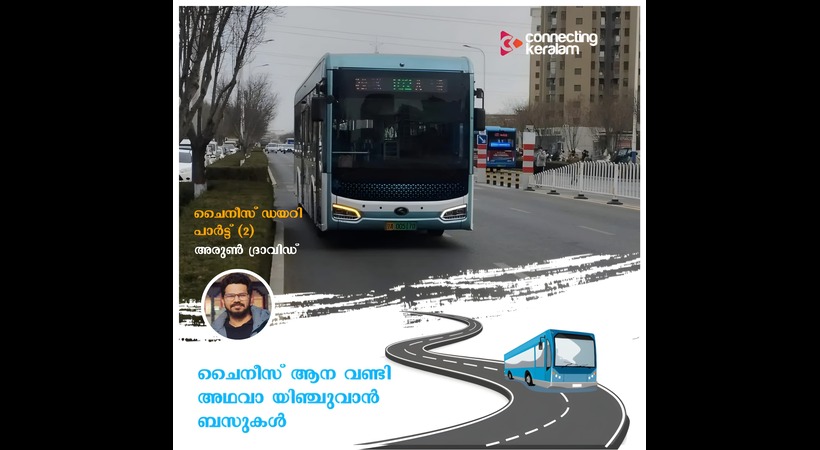 ഇലക്ട്രിക് ബസുകളാണ് മുഴുവനും. നിരന്ന-പരന്ന ഭൂമി ആയതിനാൽ ഇലക്ട്രിക് ബസുകൾക്ക് അനുയോജ്യമായ റോഡുകളാണ്. റോഡിനോട് വളരെ ചേർന്നാണ് ബസിന്റെ പടി. അതുകൊണ്ട് ബസ്റ്റോപ്പിൽ നിൽക്കുന്ന ആൾക്ക് എളുപ്പം ബസിലേക്ക് കയറാനാകും. കുത്തി നിറച്ചു ആളെ കയറ്റുന്ന രീതിയില്ല; ഓരോ അഞ്ച്-പത്തു മിനിറ്റിനുള്ളിലും ബസുകൾ വന്നുകൊണ്ടേയിരിക്കും. നമ്മുടെ നാട്ടിലെ പോലെ കണ്ടക്ടർ – ക്ളീനർ ഒന്നുമില്ല, ഡ്രൈവറുടെ സീറ്റിനു സമീപത്തെ വാതിലിലൂടെ മാത്രമേ നമുക്ക് അകത്തു കയറാനാകു. കയറുമ്പോൾ ഒരു യുവാൻ (1 RMB – ആണ് ബസ് പോകുന്ന എല്ലായിടത്തേക്കും ഒരു യുവാൻ മതി നമ്മുടെ പോലെ ഫെയർസ്റ്റേജ് ഇല്ല) പെട്ടിയിൽ ഇടണം അല്ലെങ്കിൽ ടികെറ്റ് എടുക്കാനായി വെച്ചിരിക്കുന്ന യന്ത്രത്തിൽ സ്കാൻ ചെയ്യണം. സ്ഥലം എത്തി കഴിഞ്ഞാൽ ബസിന്റെ ഒത്ത നടുവിൽ ഉള്ള എക്സിറ്റ് വാതിലിലൂടെ മാത്രമേ പുറത്തേക്ക് ഇറങ്ങാനാകു. ബസിൽ ക്യാമറ ഉള്ളതിനാൽ എക്സിറ്റ് വാതിലിലൂടെ ആരെങ്കിലും കയറിയാൽ ഡ്രൈവർ ഉടനെ അയാളെ വിളിക്കും.